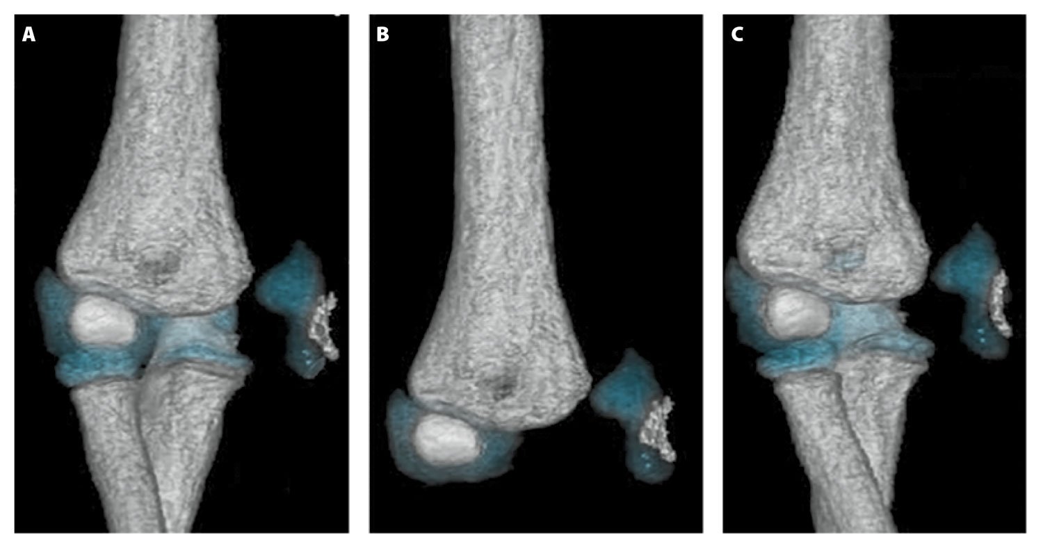 Figure 5.3-D volume renderings of the right elbow, demonstrating a displaced osteocartilaginous medial condyle and epidondyle fracture fragment along the medial aspect of the elbow joint. Images courtesy of the authors